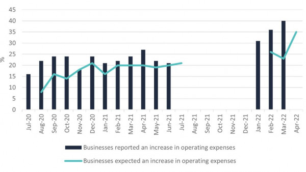 Inflation was the key driver of this month’s insights into Australian business conditions and sentiments. The data released by the ABS found that 39% of businesses expect to increase their prices more than usual over the next three months. Businesses are claiming that the pricing pressure is coming from non-staff related operating expenses including rising fuel and energy costs and increases to the cost of goods and services used by the businesses. In addition, 40% of all businesses reported increases in operating expenses over the last month, compared to 24% in March 2021.
