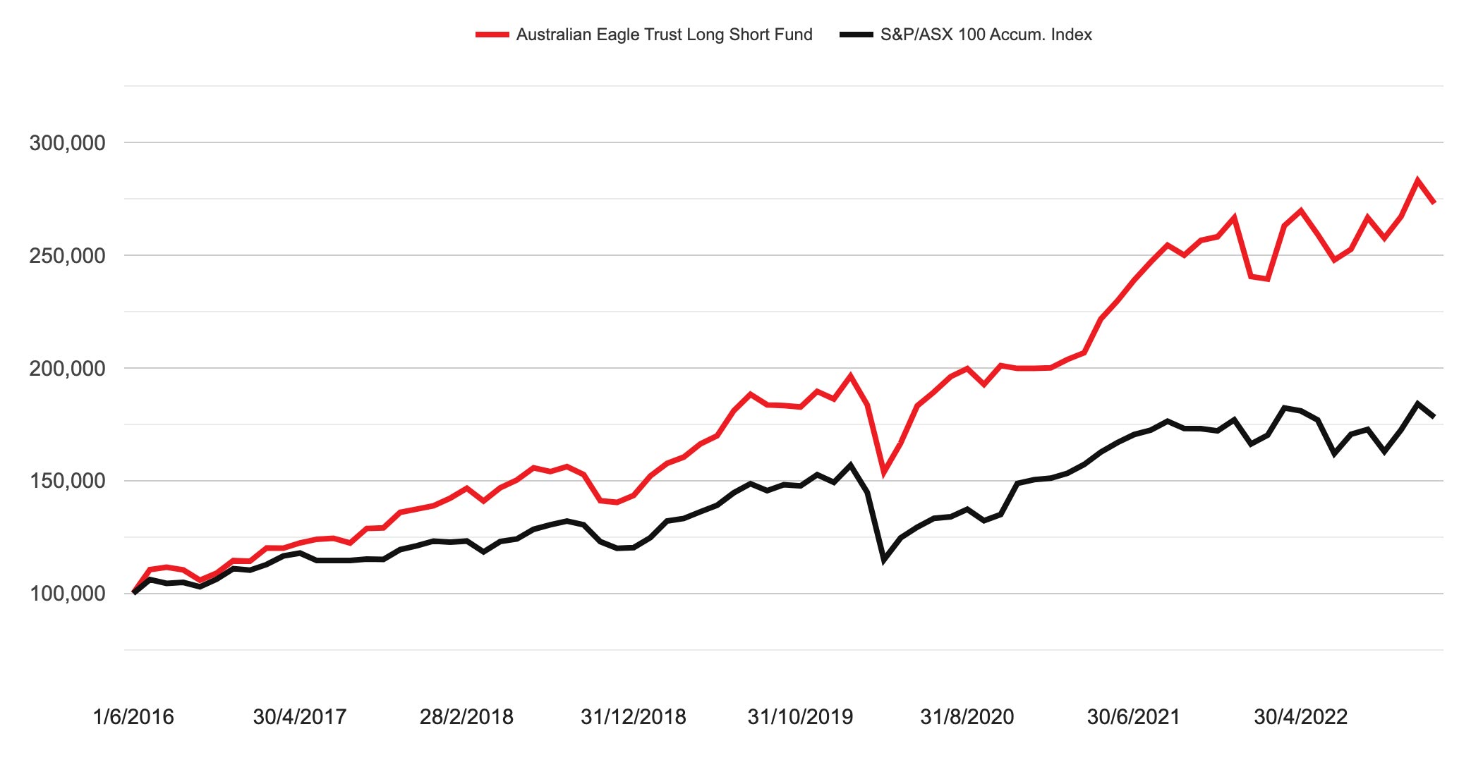The Australian Eagle Trust, Long Short Fund (The Fund) is an open-ended, Australian-registered managed investment scheme with a minimum investment of $20,000. The objective of the Fund is to outperform the S&P/ASX 100 Accumulation Index over five years[1].