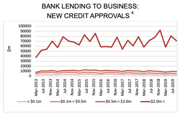 Total bank lending to business new credit approvals4 which represents new loans approved, for the year ended September 2019 for loans under $2 million, amounted to AUD $67.540 billion, down 10.88% and AUD $8.249 billion on the previous 12-month period. Meanwhile, loans over $2 million amounted to AUD $302.835 billion, up 5.59% and AUD $16.032 billion on the previous 12-month period.