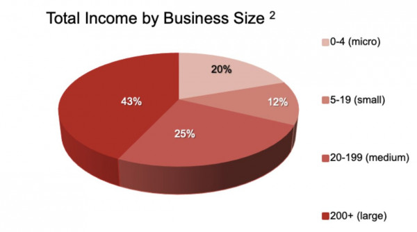 SMEs also account for a significant proportion of private sector income. As at 30 June 2019, private sector income totalled $3.7 trillion, of which small businesses (5-19 employees) accounted for $462 billion and medium businesses (20 – 199 employees) $919 billion.