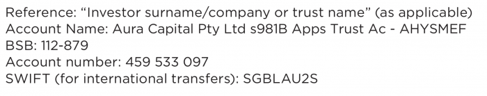 The Aura Private Credit Income Fund has its own separate bank account. Investors must remember to utilise their investor surname/company or trust name as their payment reference to ensure there are no administrative delays in correctly allocating your proceeds.