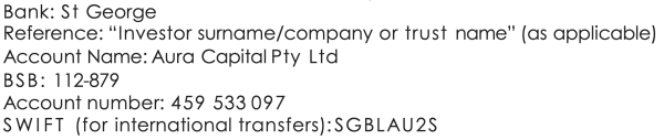 The Aura Private Credit Income Fund has its own separate bank account. Investors must remember to utilise their investor surname/company or trust name as their payment reference to ensure there are no administrative delays in correctly allocating your proceeds.